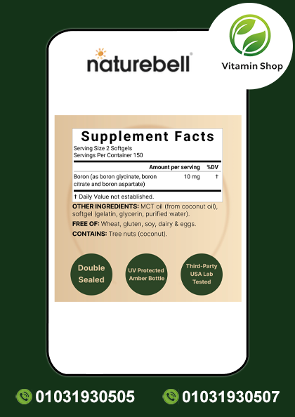 Naturebell Boron 10mg with MCT Oil is a high-absorption dietary supplement designed to support bone health, joint function, hormone balance, and overall wellness. Boron is a trace mineral that plays an essential role in calcium and magnesium metabolism, making it a key nutrient for maintaining strong bones and healthy hormone function.