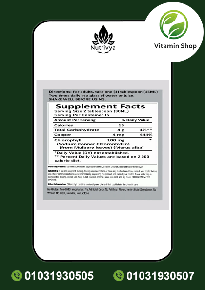 Each serving of Nutrivya Liquid Chlorophyll delivers 100 mg of high-quality derived from natural plant sources. The formula helps support liver function, promoting the removal of toxins and maintaining a healthy internal environment. Many individuals also rely on chlorophyll to help neutralize body odors and support better breath freshness from within, creating a natural deodorizing effect.